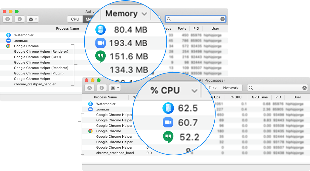 The worst part of being in a video call is feeling like you have to close everything in order for the video to be good. Not with Watercooler. Watercooler uses less memory and than any other video conferencing app with comparable CPU.